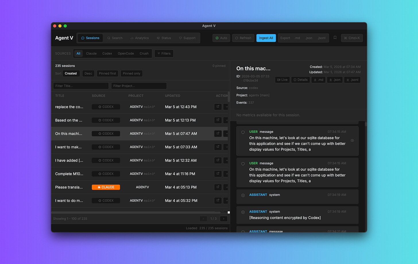 Agent V (v for visualizer) is a CLI and desktop GUI that ingests logs and session data from AI programming agents/assistants and displays them. Right now it supports Codex, Claude, OpenCode, and Crush. It’s been interesting to take a peek into how I use agents and the estimated token costs of what I ask them to do. It would be interesting to see how much it costs the companies hosting the models and the carbon footprint of my work.