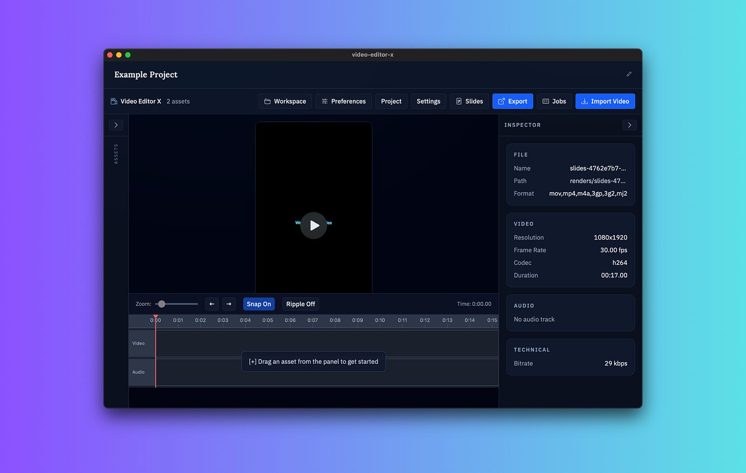 The core problem this project this solves for me is wanting to take advantage of ffmpeg and its powerful set of features. I want a simple editing setup and a way to draw audio visualizations using it with a GUI. I also want to be able to take markdown slides and turn them into simple video with audio voiceover. It takes advantage of browser APIs exposed by WebViews for audio recording, editing and parsing libraries that JS can provide like codemirror, as well as htmltocanvas for markdown to html to png for the backend to put together in a video.